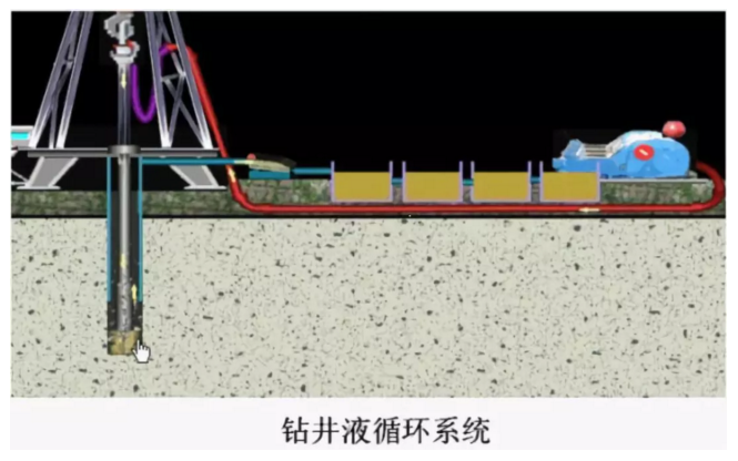 鉆井泵將泥漿從泥漿罐中吸入,經(jīng)鉆井泵加壓后的泥漿,經(jīng)過高壓管匯、立管、水龍帶,進(jìn)入水龍頭,通過空心的鉆具下到井底,從鉆頭的水眼噴出,經(jīng)井眼和鉆具之間的環(huán)行空間攜帶巖屑返回地面,從井底返回的泥漿經(jīng)各級(jí)泥漿凈化設(shè)備,除去固相含量,然后重復(fù)使用。